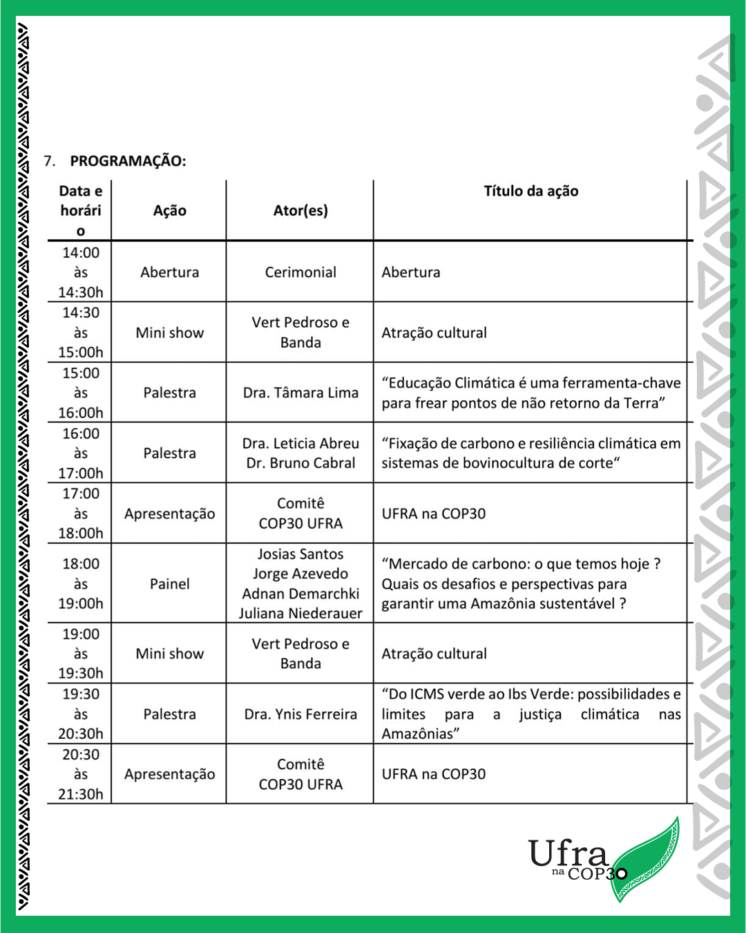 A programação será das 14h às 21h, e contará com atrações culturais, palestras, apresentações do Comitê Ufra, dentre outros. Confira abaixo.